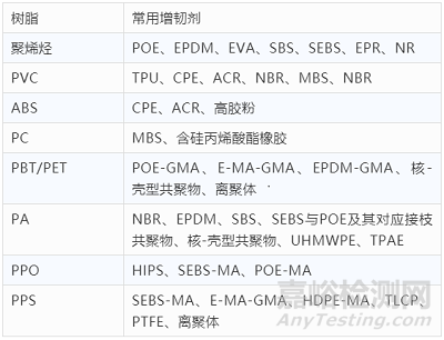 常用的有ACR-丙烯酸酯類(lèi)樹(shù)脂、MBS-甲基丙烯酸甲酯-丁二烯-苯乙烯共聚物、CPE-氯化聚乙烯、ABS、EVA、EPT-三元乙丙膠等。