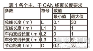 7) 不要在干擾源附近布置CAN總線,如果無(wú)法避免,應(yīng)使用屏蔽線。當(dāng)使用屏蔽線時(shí),屏蔽層必須在任一端接地( 或兩端屏蔽層接地)。整車線束中CAN線各個(gè)主干、支線長(zhǎng)度的要求,如下表1: