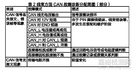 能實(shí)際的CAN 檢測(cè)電路更復(fù)雜,首先要定好需要檢測(cè)的故障類型,然后根據(jù)故障類型設(shè)計(jì)檢測(cè)電路;故障類型如表2 所示。