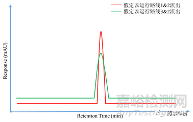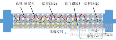 Van Deemter方程中的A項(xiàng)稱之為渦流擴(kuò)散項(xiàng)(Eddydiffusion),描述了由于色譜柱中固定相粒子的存在而引起的峰展寬。通俗的解釋就是:色譜柱當(dāng)中滿充固定相填料,而這些填料的存在會(huì)阻礙溶質(zhì)分子運(yùn)行,填料粒徑越大,溶質(zhì)分子“繞行”距離就越遠(yuǎn),或在填料孔徑中停留的時(shí)間就越長(zhǎng)。如圖2所示,假設(shè)運(yùn)行路線2為理想運(yùn)行路線(長(zhǎng)直路線幾乎無(wú)繞行),運(yùn)行路線1和運(yùn)行路線3為非理想運(yùn)行路線(繞行明顯)。當(dāng)溶質(zhì)分子沿路線2和路線1流出時(shí),此時(shí)譜帶寬度較?。▓D2中標(biāo)示為“帶寬1”),離散程度較小,將得到如圖3所示譜帶展寬較小的紅色流出譜圖;當(dāng)溶質(zhì)分子沿路線2和路線3流出時(shí),譜帶寬度較大(圖2中標(biāo)示為“帶寬2”),離散程度較大,將得到如圖3所示譜帶展寬較嚴(yán)重的綠色流出譜圖。因此渦流擴(kuò)散效應(yīng)亦被稱作“多路徑效應(yīng)”。該效應(yīng)與填料的粒徑、形狀、孔徑的形狀及結(jié)構(gòu)有關(guān),而與流速的大小無(wú)關(guān)。填料粒徑越大、填料形狀越不規(guī)則、孔徑的形狀與結(jié)構(gòu)越不規(guī)整,溶質(zhì)分子的多路徑效應(yīng)越發(fā)明顯,離散程度越大,柱效越低,峰展寬越嚴(yán)重。