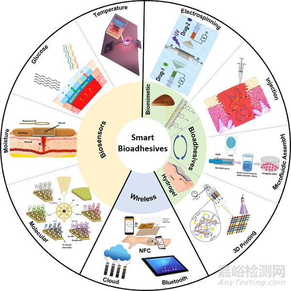 術(shù)后傷口恢復(fù)和免疫缺陷造成的慢性傷口潰爛是臨床醫(yī)學(xué)上的難點(diǎn),且患者比例逐年上升。通過(guò)使用傷口敷料固定傷口切面﹑抵抗細(xì)菌感染﹑施加生長(zhǎng)因子﹑誘導(dǎo)免疫系統(tǒng)有序反應(yīng)是加速傷口愈合的主要手段。傳統(tǒng)的傷口敷料研究關(guān)注敷料本身的機(jī)械性能,包括黏性和內(nèi)聚力,自然界中廣泛存在的生物黏附現(xiàn)象從材料和結(jié)構(gòu)兩方面為傷口敷料設(shè)計(jì)提供了極大靈感。近期提出的水凝膠由于其良好的生物兼容性﹑優(yōu)異的藥物輸運(yùn)性以及外場(chǎng)可控交聯(lián)方式,在傷口敷料方向展現(xiàn)了巨大的應(yīng)用前景。最新研究表明光﹑電﹑機(jī)械刺激和它們之間的協(xié)同刺激都可以促進(jìn)生長(zhǎng)因子分泌和組織再生,極大地加快傷口愈合。除了傷口治療,將柔性傳感器集成在敷料中對(duì)傷口進(jìn)行實(shí)時(shí)檢測(cè)和評(píng)估也是閉環(huán)智能傷口敷料的重要功能。傷口傳感數(shù)據(jù)通過(guò)先進(jìn)的無(wú)線技術(shù)與終端設(shè)備進(jìn)行交互,促發(fā)藥物管理系統(tǒng)進(jìn)行智能化藥物釋放,保證傷口有效愈合。該文章從材料﹑結(jié)構(gòu)以及系統(tǒng)三個(gè)方面介紹了敷料,傳感器以及無(wú)線技術(shù)在閉環(huán)智能傷口敷料的最新研究進(jìn)展進(jìn)行了詳細(xì)綜述 (圖1)。
