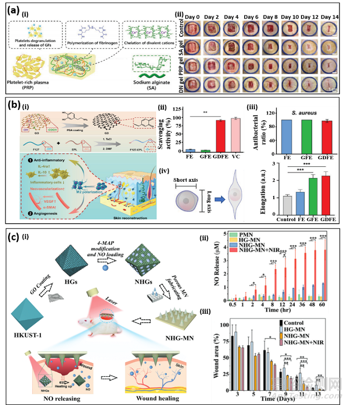 圖2:免疫調(diào)節(jié)水凝膠. (a)基于血漿與海藻酸鈉雙網(wǎng)絡(luò)水凝膠;(b)F127水凝膠摻雜多巴胺修飾氧化石墨烯和ε-聚賴氨酸同時(shí)具有抗菌和免疫調(diào)節(jié)的作用;(c)MOF顆粒修飾聚乙二醇水凝通過(guò)可持續(xù)釋放一氧化氮?dú)怏w調(diào)節(jié)傷口愈合免疫反應(yīng)