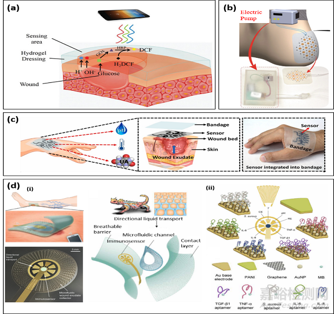圖3:用于傷口監(jiān)測(cè)的柔性生物傳感器. (a)基于酸堿指示劑和熒光反應(yīng)監(jiān)測(cè)傷口pH值與葡萄糖濃度;(b)釕化合物的熒光反應(yīng)檢測(cè)傷口處氧含量;(c)基于激光誘導(dǎo)石墨烯和MXene復(fù)合材料的柔性pH,溫度與尿酸傳感器;(d)針對(duì)慢性傷口炎癥檢測(cè)的適配體電化學(xué)傳感器
