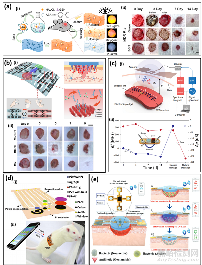 圖4:集成生物檢測(cè)、治療與無(wú)線數(shù)據(jù)傳輸?shù)闹悄軅诜罅?。(a)基于金納米顆粒藥物的抗菌傷口敷料及其納米藥物殘留自檢測(cè)機(jī)制;(b)集成微流管道和多孔水凝膠微針進(jìn)行有效傷口滲出液收集與生長(zhǎng)因子釋放;(c)導(dǎo)電纖維傷口縫線與插指電極構(gòu)成的LC震蕩電路對(duì)內(nèi)部傷口泄露與縫線斷裂進(jìn)行監(jiān)測(cè);(d)基于無(wú)線近場(chǎng)傳輸?shù)拈]環(huán)智能傷口敷料實(shí)現(xiàn)傷口溫度﹑pH﹑尿酸的檢測(cè)以及抗菌藥物的釋放;(e)基于藍(lán)牙無(wú)線傳輸?shù)拈]環(huán)智能傷口敷料實(shí)時(shí)監(jiān)測(cè)傷口溫度異常并遠(yuǎn)程開(kāi)啟UV-LED進(jìn)行殺菌