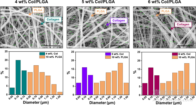 微米級的PLGA纖維可以模擬3D細(xì)胞外基質(zhì)(ECM)結(jié)構(gòu),納米級的膠原纖維模擬ECM纖維的局部粘附結(jié)構(gòu),起到協(xié)調(diào)組織發(fā)育和維持的細(xì)胞行為的作用。膠原蛋白溶液的濃度4,5,6wt%,在25kV功率和1.2mL/h流速下紡絲,可以避免膠原蛋白串珠纖維的形成。靜電紡纖維樣品的厚度為500±10μm。如下圖所示:Col/PLGA貼片的SEM圖像及其纖維直徑分布。所有樣品中PLGA纖維的直徑范圍為0.5和1.5μm,而膠原纖維的直徑范圍為50-250nm。