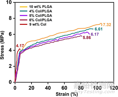 拉伸強(qiáng)度和伸長率均隨膠原含量的增加而降低,但差異不顯著;
