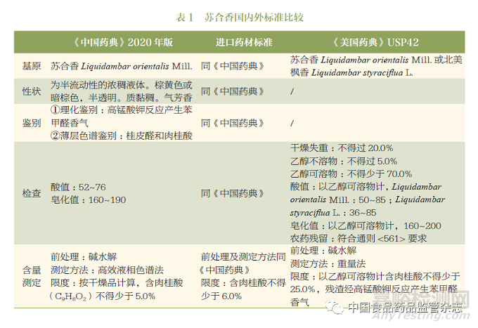 蘇合香現(xiàn)收載于《中國藥典》2020 年版一部及進口藥材標準和《美國藥典》USP42。綜合來看,主要包括基原、性狀、鑒別、檢查和含量測定。其中,《中國藥典》及進口藥材標準基本一致;而《美國藥典》較《中國藥典》多增加了北美楓香Liquidambar styraciflua L.這一基原;三個標準最大的區(qū)別在于含量測定的限度以及測定方法不一致,具體詳細信息見表1。