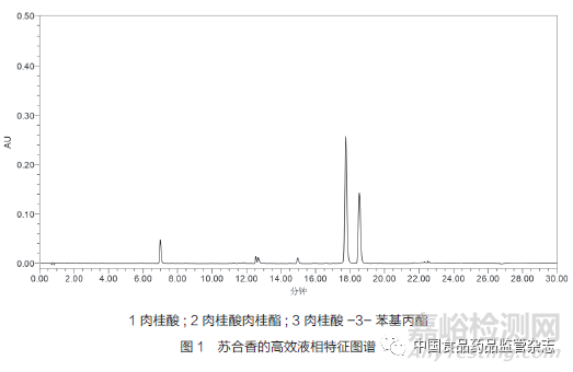 最后,對于標準中含量測定的指標選擇問題,上述標準中均采用堿水解的方式測定水解后的總?cè)夤鹚岬暮?,這種測定轉(zhuǎn)化后的成份而不是選擇測定原型成份的做法無法體現(xiàn)蘇合香的成份類型,且質(zhì)控指標單一且專屬性不強,可能會出現(xiàn)企業(yè)為滿足《中國藥典》的標準而摻偽摻假。通過對蘇合香成份溶解性的研究以及對其物質(zhì)基礎的了解,對蘇合香進行了特征圖譜的研究,發(fā)現(xiàn)肉桂酸、肉桂酸肉桂酯及肉桂酸-3-苯基丙酯等成份是蘇合香的代表性化學成份,詳見圖1。因此,建議綜合考慮蘇合香標準中含量測定的指標以及前處理方法,增加測定方法的專屬性。