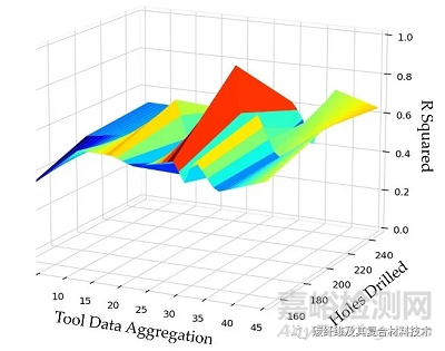 Alchemite™ 可以識別用于預測未來工具性能的最佳鉆孔。該圖顯示了如何通過優(yōu)化數(shù)據(jù)聚合來提高模型(R平方)的準確性,以及來自200次測試(“鉆孔”)的數(shù)據(jù)能夠較高的準確性。