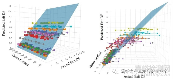 圖2:3D圖的兩個投影顯示了出口分層因子(DF)的預測精度如何隨鉆孔數(shù)量而變化。連接點中的每個顏色表示一個獨特的刀具復合對。
