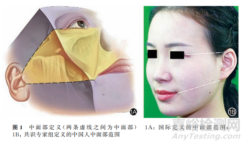 中面部指面中部三分之一的部分。國(guó)際上認(rèn)為上界為外眼角至耳輪角的連線(xiàn),下界為耳屏軟骨下緣至口角點(diǎn)下方的連線(xiàn)。根據(jù)《中國(guó)人群中面部年輕化治療專(zhuān)家共識(shí)》,結(jié)合中國(guó)人特征,中面部上界為顴弓向外延續(xù)至耳輪上緣、向內(nèi)延續(xù)至外眥的連線(xiàn),下界為口角至耳垂的連線(xiàn)。鼻部為獨(dú)立美學(xué)單元,不列入中面部年輕化治療范疇。