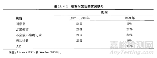 美國(guó)FDA每年大約要對(duì)1050個(gè)臨床試驗(yàn)進(jìn)行視察。這些視察中,包括約700個(gè)研究者、250個(gè)IRB和100個(gè)研究機(jī)構(gòu)( Steinbock,2002a)。表14.4.1列出了視察中所發(fā)現(xiàn)的最常見(jiàn)缺陷。其中之一是方案偏離,據(jù)Lisook(1990)報(bào)告,發(fā)生的情形在1977-1990年期間所進(jìn)行的視察中占26%。這一情形在目前的試驗(yàn)中沒(méi)有得到改進(jìn)。Woollen(2000b)報(bào)告,1999年所視察的試驗(yàn)方案偏離發(fā)生率為27%。因此,臨床試驗(yàn)的實(shí)施和操作過(guò)程中出現(xiàn)方案偏離是一個(gè)共同的問(wèn)題,20世紀(jì)后25年中被視察的試驗(yàn)偏離率大約為25%。