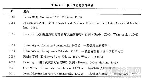 方案偏離和違背是非主觀偏離,因?yàn)樵谂R床試驗(yàn)方案執(zhí)行過(guò)程中不順利或出現(xiàn)一些過(guò)失。但是,如果方案偏離是故意的,就稱之為臨床試驗(yàn)的誤導(dǎo)( misconduct)或欺騙(fraud)。盡管臨床試驗(yàn)的誤導(dǎo)或欺騙很罕見(jiàn),但確有其事。表14.4.2列出了一些有名的臨床試驗(yàn)的誤導(dǎo)案例。其中的一些誤導(dǎo)包括偽造數(shù)據(jù)或篡改數(shù)據(jù)。