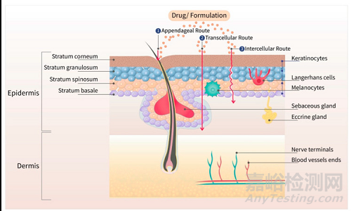 圖1:不同的皮膚層有三種主要的藥物運輸途徑