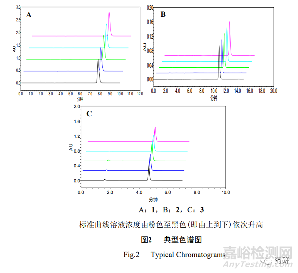分別取“2.1.2”項(xiàng)下 1~3 標(biāo)準(zhǔn)曲線溶液,分別按“2.1.1”項(xiàng)下方法進(jìn)樣測定,結(jié)果見圖 2。1~3 峰理論塔板數(shù)分別為 13 026、10 733、10 312,拖尾因子分別為 1.15、1.32、1.12;標(biāo) 準(zhǔn)曲線溶液(中間濃度點(diǎn))連續(xù)進(jìn)樣 5 針的峰面積 RSD(n=5)分別為 0.05%、0.11%、0.17%。