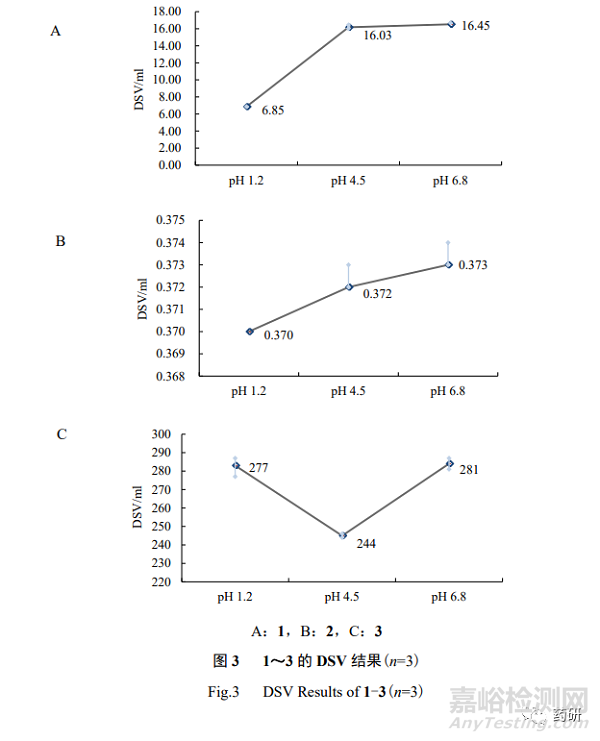 在整個(gè)研究過程中發(fā)現(xiàn),2 和 3 在 3 個(gè)不同 pH 值緩沖液中較穩(wěn)定,1 在 pH 6.8 緩沖液中 會(huì)發(fā)生降解,在試驗(yàn)過程中溶液會(huì)由無色逐漸變?yōu)榉凵罱K變?yōu)楹谏?,并伴有黑色沉淀產(chǎn) 生。由于整個(gè)試驗(yàn)過程中溶液始終保持過飽和狀態(tài),因此,通過 HPLC 測定仍然能夠找到溶 解平衡點(diǎn)。通過多重光散射儀對溶液的透光率進(jìn)行分析,發(fā)現(xiàn) 1 在 pH 6.8 緩沖液中溶液的透 光率在 16 h 內(nèi)從 0 降至約 25%;在同樣的條件下,適當(dāng)加入維生素 C,發(fā)現(xiàn)溶液的透光率未 發(fā)生變化。通過穩(wěn)定性研究以及查閱相關(guān)文獻(xiàn)得知[17],1 在中性或堿性條件下會(huì)發(fā)生氧化反 應(yīng),產(chǎn)生黑色沉淀。從色譜分析數(shù)據(jù)以及計(jì)算結(jié)果來看,1 在 3 個(gè) pH 緩沖液條件下的平均 DSV 值均小于 250 mL,應(yīng)當(dāng)判斷為高溶解性。然而,此次研究是由國際多個(gè)實(shí)驗(yàn)室同時(shí)進(jìn)行 比對分析,對于 1 藥物,國內(nèi)、國際 3 個(gè)實(shí)驗(yàn)室得出了不同的結(jié)論,因此對于該藥物的溶解 性目前仍未給出結(jié)論。