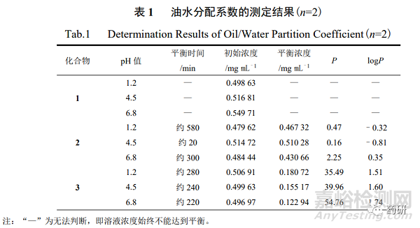 采用藥物溶解性與滲透性評價(jià)系統(tǒng)測定油水分配系數(shù),分別稱取 1~3 樣品適量,分別用 “2.2.1”項(xiàng)下不同 pH 緩沖液配制成 1~3 質(zhì)量濃度各約為 0.5 mg/mL 的溶液,分別量取上述 溶液 18 mL,置 25 mL 水浴池中,分別加入由相應(yīng) pH 緩沖液飽和的正辛醇溶液 1 mL,內(nèi)置 轉(zhuǎn)子(150 r/min),于 37 ℃水浴鍋中 24 h,光纖探頭置于緩沖液層。1~3 的檢測波長分別為 205~210 nm、275~285 nm、255~265 nm,每分鐘采集 1 次,待溶質(zhì)分配平衡時(shí)分別計(jì)算油 相(o)和水相(w)的質(zhì)量濃度(co、cw),并計(jì)算油水分配系數(shù)(P,co/cw)及 logP,結(jié)果見表 1。