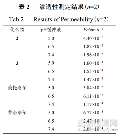 2 和 3 的滲透性測定結(jié)果見表 2(1 是主動(dòng)轉(zhuǎn)運(yùn)機(jī)制[16],通過該系統(tǒng)測定其滲透性無實(shí)際 意義),2 和 3 在不同 pH 緩沖液體系中的 Pe 值基本均大于模型藥物(2 在 pH 7.4 緩沖液體系 除外),可判斷 2 種藥物均為高滲透性藥物。