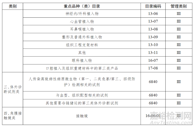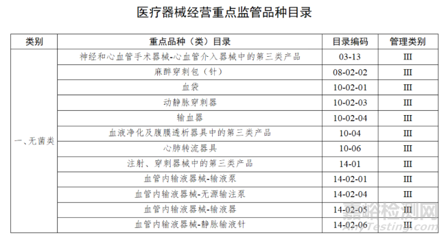 國(guó)家藥品監(jiān)督管理局根據(jù)醫(yī)療器械產(chǎn)品和產(chǎn)品經(jīng)營(yíng)風(fēng)險(xiǎn)程度,制定并動(dòng)態(tài)調(diào)整醫(yī)療器械經(jīng)營(yíng)重點(diǎn)監(jiān)管品種目錄(見文末);設(shè)區(qū)的市級(jí)負(fù)責(zé)藥品監(jiān)督管理的部門應(yīng)當(dāng)綜合分析產(chǎn)品監(jiān)督抽驗(yàn)、不良事件監(jiān)測(cè)、產(chǎn)品召回、質(zhì)量投訴、風(fēng)險(xiǎn)會(huì)商情況等因素,對(duì)國(guó)家藥品監(jiān)督管理局制定的目錄進(jìn)行補(bǔ)充,確定本行政區(qū)域醫(yī)療器械經(jīng)營(yíng)重點(diǎn)監(jiān)管品種目錄并進(jìn)行動(dòng)態(tài)調(diào)整。