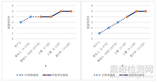如圖 2B、C、E 所示,口服混懸劑、鼻噴劑和滴眼劑在出生 28 天以上嬰幼兒至不滿 17 歲青少年年齡段內(nèi),適宜性均表述為“4,適用性良好”和“5,最適宜和優(yōu)選劑型”。對(duì)照申報(bào)情況,在獲得臨床試驗(yàn)許可的 6 件口服混懸劑(包括干混懸劑)申請(qǐng)中,申報(bào)適應(yīng)證所涉及的最低起始年齡為 1 歲,最高起始年齡為 12 歲,基本符合給藥途徑/劑型與年齡的適宜性匹配關(guān)系。在立項(xiàng)通過的 5 件鼻噴劑申請(qǐng)中,申報(bào)適應(yīng)證所涉及的最低起始年齡為出生后 3 月齡,最高起始年齡為 6 歲,基本符合給藥途徑/劑型與年齡的適宜性匹配關(guān)系。在立項(xiàng)通過的 3件滴眼劑申請(qǐng)中,申報(bào)適應(yīng)證所涉及的起始年齡為出生后 3 月齡,基本符合給藥途徑/劑型與年齡的適宜性匹配關(guān)系。