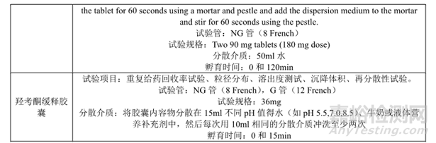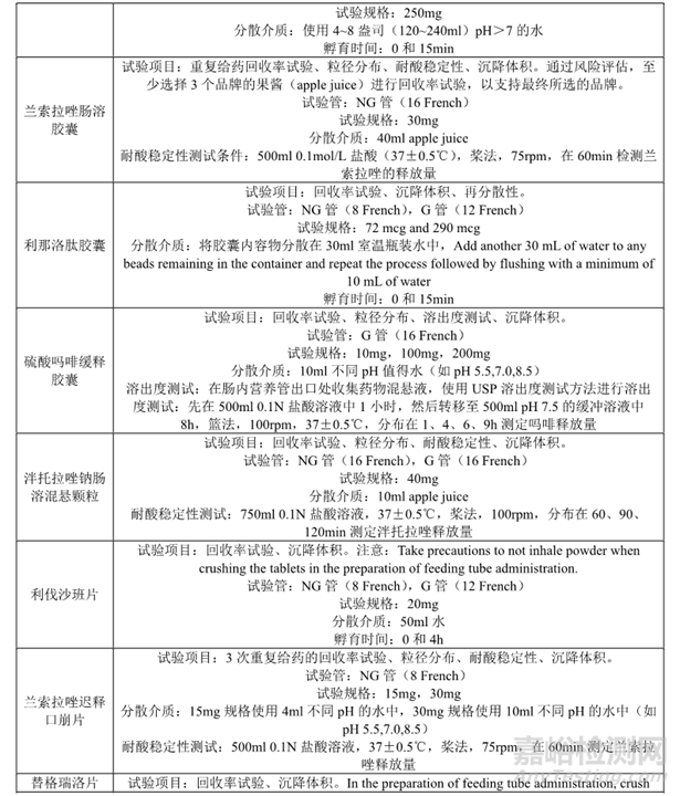 經(jīng)腸內(nèi)營養(yǎng)管給藥,即通過腸內(nèi)營養(yǎng)管(諸如鼻胃管、鼻十二指腸管、胃造口術(shù)管等)將藥物直接輸入胃腸道,這種劑型對無法吞咽口服劑型的患者十分重要。但目前我國尚無相關(guān)技術(shù)指導(dǎo)原則可供參考,美國FDA已有相關(guān)指南供業(yè)界參考,如《Oral Drug Products Administered Via Enteral Feeding Tube: In Vitro Testing and Labeling Recommendations》。此外,美國也有較多的個藥指南針對腸內(nèi)營養(yǎng)管給藥的體外對比研究試驗(yàn)給出相關(guān)參考。