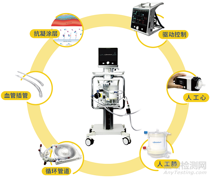 其中,體外心肺支持輔助設備由主機、泵驅動裝置、緊急泵驅動裝置、備用電池、流量氣泡傳感器等組成。一次性使用膜式氧合器套包由膜式氧合器及動靜脈管路組件(含離心泵泵頭),預充管路組件,配件包組件和氧氣管路組成。