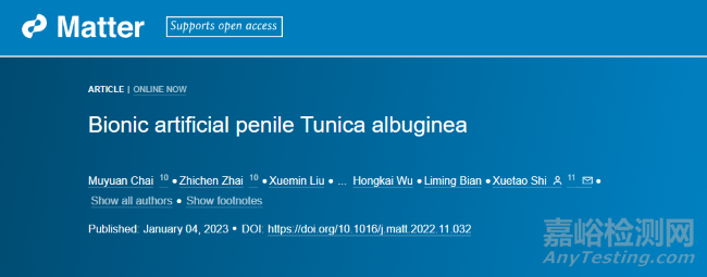 針對這一難題,華南理工大學材料科學與工程學院施雪濤教授研究團隊報道了一種微結構仿生的人造白膜補片,通過合成水凝膠模擬了天然白膜雙層彎曲取向的纖維結構,其具有與天然白膜相似的力學特性,并在巴馬豬陰莖白膜缺損模型中取得了良好的修復效果。相關論文“Bionic Artificial Penile Tunica Albuginea”發(fā)表于材料學知名期刊《Matter》。