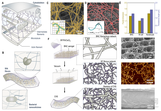 近日,上??萍即髮W(xué)凌盛杰課題組和東北林業(yè)大學(xué)陳文帥課題組合作設(shè)計了以細(xì)胞骨架啟發(fā)的IS (cytoskeleton-inspired IS, CIIS)。如圖1所示,第一個網(wǎng)絡(luò)是由細(xì)菌納米纖維素組成的框架,它具有與微管和肌動蛋白微絲相似的結(jié)構(gòu)特征和相當(dāng)?shù)某掷m(xù)長度和分形維數(shù)(圖1D和E),作為維持IS結(jié)構(gòu)完整性的支撐框架,使IS具有機(jī)械順從性。第二個網(wǎng)絡(luò)是絲素分子鏈(圖1B),絲素蛋白的稀疏結(jié)晶相交聯(lián)和拉伸特性使IS有效地將局部誘導(dǎo)的機(jī)械應(yīng)力分散到IS內(nèi)部的更大區(qū)域,從而可有效實現(xiàn)材料中的應(yīng)力分散。
