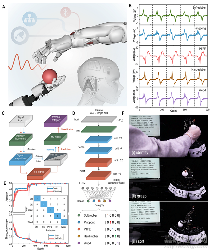 基于電子皮膚在識別方面的需求,可將其組裝成類皮膚摩擦發(fā)電機(jī)(SL-TENG),其中可使用CIIS和丙烯酸彈性體分別作為電極和介電材料,將其組裝成智能傳感識別系統(tǒng)。如圖3所示,當(dāng)SL-TENG接觸不同材料時,不同物體產(chǎn)生的輸出電壓信號的峰值輪廓具有可重現(xiàn)性差異,在某些情況下,這些差異相對較弱,很難被人類區(qū)分出來。然而,通過數(shù)值優(yōu)化方法,使用機(jī)器學(xué)習(xí)(ML)模型可以擬合決策結(jié)果,并在訓(xùn)練過程中主動發(fā)現(xiàn)隱藏在信號中的特征?;谘h(huán)神經(jīng)網(wǎng)絡(luò)構(gòu)建ML模型,對軟橡膠、乒乓球、聚四氟乙烯、硬橡膠和木材等不同介質(zhì)物體產(chǎn)生的輸出電壓信號進(jìn)行訓(xùn)練和聚類。為了避免同一材料信號強度的差異導(dǎo)致過擬合,在模型開始時采用批歸一化和密集層對信號進(jìn)行歸一化,然后對信號進(jìn)行預(yù)處理,提取初步特征。為了提高時間信號分類的可靠性,該模型以長短期記憶網(wǎng)絡(luò)為核心。最后,模型通過softmax函數(shù)歸一化后,輸出物體屬于每個材料類別的概率。在沒有過擬合的情況下,信號分類精度收斂于100%,高識別成功率使構(gòu)建的人形機(jī)械手能夠系統(tǒng)地模擬人手對這種介電物體的識別和分類。通過物聯(lián)網(wǎng)技術(shù)將SL-TENG集成在機(jī)械手的手指上,手指敲擊電介質(zhì)物體五次后,SL-TENG能夠準(zhǔn)確識別出球的材料類型,并將其送入帶有相應(yīng)標(biāo)簽的籃子中。在600次分類測試中,機(jī)械手的成功率高達(dá)97.2%,證明了SL-TENG在識別和分類任務(wù)中的有效性和準(zhǔn)確性。此外,即使部分受損,這些機(jī)械手仍可以正常工作。在480次分選試驗中,分選成功率仍高達(dá)98.1%。