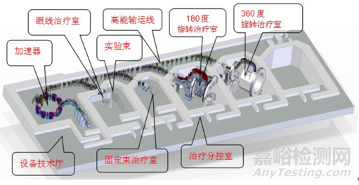 按照治療室的數(shù)量不同,質(zhì)子治療系統(tǒng)還可以劃分為多室治療系統(tǒng)和單室治療系統(tǒng)。多室治療系統(tǒng)包含一臺(tái)加速器和至少兩個(gè)治療室,單室治療系統(tǒng)通常由一臺(tái)加速器和一個(gè)治療室組成。以臨床上常見的多室質(zhì)子治療系統(tǒng)結(jié)構(gòu)為例,系統(tǒng)布局如圖1所示。