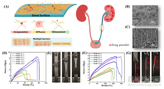 圖1. NFBT的形態(tài)和機(jī)械行為:(A)NFBT和US的加載策略示意圖;(B)NFBT潤濕前的SEM圖像;(C)NFBT潤濕后的SEM圖像;(D)NFBT的應(yīng)力-應(yīng)變曲線;(E)NFBT在拉伸試驗(yàn)中的行為;(F)和(G)NFBT的結(jié)合強(qiáng)度