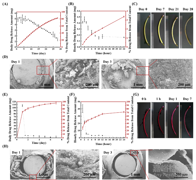 圖2. NFBT-NFT和NFBT-RB的藥物釋放特性。(A)和(B)NFBT-NFT的長期和短期藥物釋放曲線;(C)NFBT-NFT在體外藥物釋放7、21、28天前后的圖像;(D)NFBT-NFT在第一天和第三天的SEM圖像。(E)和(F)NFBT-RB的長期和短期藥物釋放曲線;(G)NFBT-RB在體外釋放1小時(shí)、1天和7天后的圖像;(H)NFBT-NFT在第一天和第三天的SEM圖像。