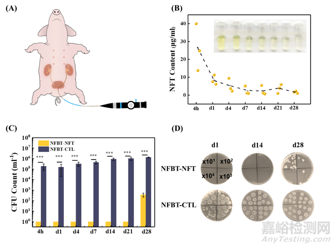 圖3:NFBT-NFT組和NFBT-CTL組尿液分析:(A)植入方法示意圖;(B)檢測到的豬尿中NFT含量;(C和D)通過瓊脂平板計(jì)數(shù)測量的尿液中細(xì)菌濃度。***p < 0.001