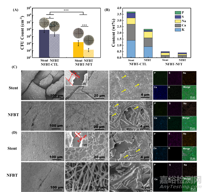 圖4. 支架各部分的體內(nèi)生物膜的形成和結(jié)殼情況。(A) CFU細(xì)菌計(jì)數(shù);(B) 表面元素分析;(C) NFBT-CTL的SEM圖像和EDS分析;(D) NFBT-NFT的SEM圖像和EDS分析。*P < 0.05, **P < 0.01, ***P < 0.001