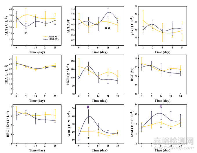 圖5. 植入期間試驗(yàn)動(dòng)物血液主要指標(biāo)。NFBT-NFT組和NFBT-CTL組之間的顯著差異用*(P<0.05),**(P<0.01)標(biāo)記,與第0天相比,顯著差異用#(P<0.05),##(P<0.01)標(biāo)記。
