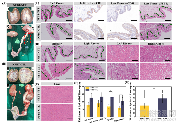 圖6. 泌尿系統(tǒng)的組織學(xué)檢查:(A)和(B)腎臟和尿路的一般觀察;(B-E)植入后28天的代表性HE、CD3和CD68染色切片(比例尺,100μm);(F)輸尿管和膀胱上皮組織厚度的統(tǒng)計(jì)分析;(G)NFBT-NFT和NFBT-CTL組上皮組織厚度的顯著性分析。