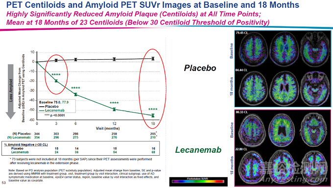 在2022年年底召開的阿爾茨海默病臨床試驗大會上,衛(wèi)材和渤健公布Leqembi的3期臨床試驗數(shù)據(jù)。與安慰劑相比,Leqembi在18個月后將評估患者認(rèn)知和日常功能的綜合評分CDR-SB的增加速度降低27%(CDR-SB評分越高意味著患者臨床功能越低),并在18個月里將淀粉樣蛋白沉積水平降低約70%。在接受治療6個月后,Leqembi組與安慰劑組的CDR-SB評分就出現(xiàn)統(tǒng)計顯著的差別,并且在治療過程中差別持續(xù)擴大。這一結(jié)果代表著靶向淀粉樣蛋白的阿爾茨海默病療法在3期臨床試驗中的重要突破。FDA預(yù)計不久后會收到此一完整數(shù)據(jù)的遞交。