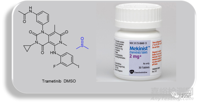到目前為止,DMSO 尚未作為口服給藥系統(tǒng)的賦形劑,但DMSO 可以作為活性藥物的組分參與,要么作為金屬絡(luò)合物中的配體,要么作為溶劑化物分子(類(lèi)似于水合物hydrate中的水分子)。2013 年,葛蘭素史克獲準(zhǔn)將 Mekinist®(曲美替尼,活性成分trametanib dimethyl sulfoxide)作為黑色素瘤 (melanoma) 治療藥物上市銷(xiāo)售。 曲美替尼每天給藥一次(2 mg曲美他尼),因此劑量中 DMSO 的濃度非常低。