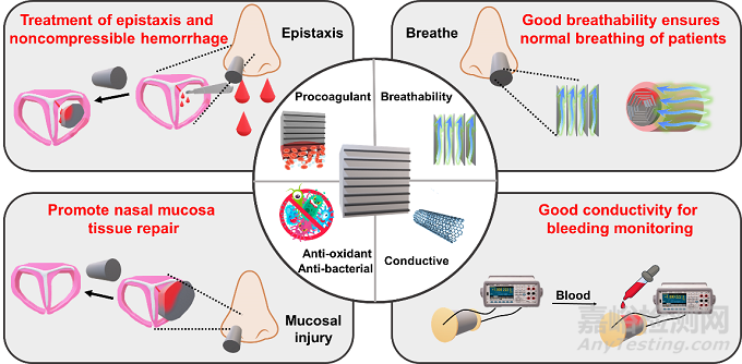 西安交通大學(xué)前沿科學(xué)技術(shù)研究院郭保林教授團(tuán)隊(duì)在止血和促進(jìn)組織修復(fù)領(lǐng)域的持續(xù)的相關(guān)研究(Biomaterials 2017, 122, 34−47; Nat. Commun. 2018, 9, 2784; Biomaterials 2018, 183, 185−199; Small 2019, 15, 1900046; Adv. Funct. Mater. 2020, 30, 1910748; ACS Appl. Mater. Interfaces 2020, 12, 35856−35872; Chem. Mater. 2020, 32, 6595−6610; Chem. Eng. J. 2021, 403, 126329; ACS Nano 2021, 15, 7078−7093; Small 2021, 17, 2101356)的基礎(chǔ)上,創(chuàng)新性的設(shè)計(jì)了一種基于兒茶酚改性聚乙烯醇、季銨化殼聚糖和碳納米管的智能取向?qū)щ娡笟庵寡z用于凝血障礙性鼻腔出血止血、鼻腔粘膜修復(fù)和出血監(jiān)測。