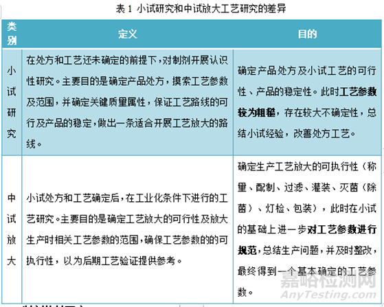 藥物制劑從研發(fā)立項(xiàng)到正式上市都會(huì)經(jīng)歷實(shí)驗(yàn)室小試研究、車間中試放大、生產(chǎn)工藝驗(yàn)證、產(chǎn)品注冊(cè)申報(bào)等階段。相較于小試研究,中式放大和工藝驗(yàn)證具有更高的成本和風(fēng)險(xiǎn),而從實(shí)驗(yàn)室研究過渡到工業(yè)化生產(chǎn)是藥物上市必須經(jīng)歷的環(huán)節(jié),也是各醫(yī)藥企業(yè)的不懈追求,其中制劑性能研究的透徹性、生產(chǎn)工藝參數(shù)的合理性直接關(guān)系到是否可以生產(chǎn)出合格的產(chǎn)品。因此,工藝放大前,需要產(chǎn)品特性進(jìn)行研究,對(duì)設(shè)備參數(shù)進(jìn)行摸索。小試研究和中試放大工藝的差異點(diǎn)見表1。