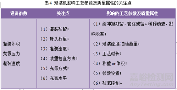 灌裝機(jī)是液體制劑進(jìn)行定量罐裝的儀器設(shè)備,其設(shè)備參數(shù)的設(shè)定也會(huì)影響產(chǎn)品工藝參數(shù)及質(zhì)量屬性,關(guān)注點(diǎn)見表4。