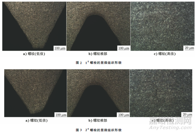 分別從1#,2#螺栓螺紋處截取縱向剖面試樣,用體積分?jǐn)?shù)為4%的硝酸乙醇溶液腐蝕,并用光學(xué)顯微鏡對(duì)試樣進(jìn)行金相檢驗(yàn),結(jié)果如圖2,3所示。由圖2可知:1#螺栓螺紋無明顯脫碳,螺紋根部牙底過渡圓滑,無毛刺等缺陷,顯微組織為回火索氏體2級(jí),符合GB/T 3098.1—2010 《緊固件機(jī)械性能螺栓、螺釘和螺柱》的要求。由圖3可知,2#螺栓的金相檢驗(yàn)結(jié)果與1#螺栓基本一致。