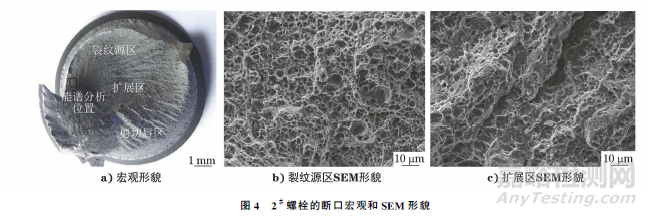 將2#螺栓斷口用線切割取樣,經(jīng)超聲清洗后,對(duì)試樣進(jìn)行宏觀觀察和SEM分析,結(jié)果如圖4所示。由圖4可知:2#螺栓的斷口斷面整體粗糙,凹凸不平,放射條紋方向明顯,斷面可分為裂紋源區(qū)、擴(kuò)展區(qū)和明顯的剪切唇區(qū)[見圖4a)];裂紋源區(qū)有較多的圓形韌窩,有輕微的剪切痕跡,說明裂紋源處有力的長(zhǎng)時(shí)間集聚,該處受力超過了螺栓的屈服強(qiáng)度;擴(kuò)展區(qū)為準(zhǔn)解理形貌,說明該區(qū)域裂紋擴(kuò)展速率較快;螺栓最終在剪切唇區(qū)發(fā)生一次性剪切斷裂。