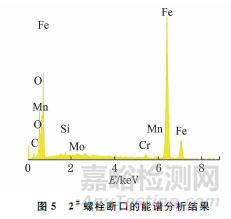 對(duì)試樣進(jìn)行能譜分析,分析位置如圖4a)所示,分析結(jié)果如圖5所示,可見Fe元素的衍射峰比較明顯,除有少量O 元素外,試樣中無其他異常元素,可排除夾雜物引起的斷裂。