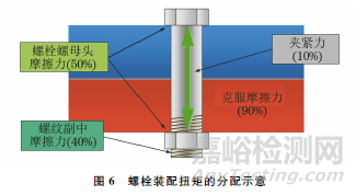 螺栓的扭矩系數(shù)K宏觀上直接反映螺栓擰緊過程中,扭矩與夾緊力之間的系數(shù),K值不僅取決于摩擦面的摩擦系數(shù),還取決于螺紋連接副的幾何狀況。對(duì)理想的螺紋連接副而言,當(dāng)摩擦系數(shù)確定后,扭矩系數(shù)也就確定了。通常情況下,在螺栓擰緊過程中100%的扭矩有90%需要用于克服摩擦力(50%用于克服螺栓螺母頭的摩擦力,40%用于克服螺紋副中的摩擦力),10%用于轉(zhuǎn)化為夾緊力(見圖6),理論上只要有足夠的夾緊力,就可以保證被夾零件在振動(dòng)、高溫及低溫等惡劣環(huán)境下安全工作。