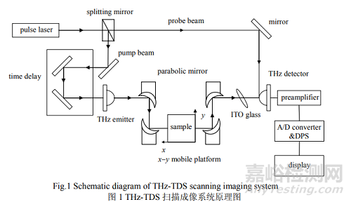 THz-TDS掃描成像系統(tǒng)具體光路如圖1所示。由脈沖激光器發(fā)出的超快激光脈沖經(jīng)過偏光分束鏡被分為兩束,一束作為泵浦光,入射到太赫茲發(fā)射器(如光電導天線、半導體晶片、非線性晶體等)上,用于產(chǎn)生太赫茲脈沖,此脈沖經(jīng)拋物面鏡聚焦后入射到待測樣品上。分束鏡分出的另一束太赫茲脈沖將作為探測光,它與從樣品中透射出的載有樣品信息的太赫茲電磁脈沖共線經(jīng)過太赫茲探測器(如GaAs光電導開關或電光晶體)。調(diào)整時間延遲裝置,測量不同探測光到達時間下太赫茲電場強度的變化量,對其進行傅里葉變換,獲得頻域上幅度和相位的變化量;最后,信號經(jīng)電流前置放大器、數(shù)字信號處理器輸入計算機,對采集到的數(shù)字信號進行圖像處理,得到被測樣品在該點處的缺陷圖像。在x-y移動臺上移動樣品,使太赫茲脈沖通過被測樣品的不同點,對其進行逐點掃描,記錄下該樣品不同位置的透射譜信息,就可以獲得整個樣品的圖像,從而測得樣品缺陷的整體存在情況。