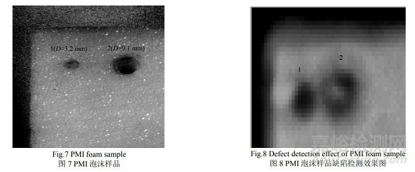 為探究太赫茲無損檢測方法對PMI泡沫的可行性,在一塊厚度為35 mm的PMI泡沫表面上預置了兩個孔洞缺陷,如圖7所示,利用THz-TDS系統(tǒng)對該樣品進行缺陷檢測,分辨力為1 mm,其成像結果如圖8所示。成像結果表明,利用太赫茲波在缺陷處發(fā)生散射這一原理對PMI泡沫進行缺陷檢測的方法,能夠有效檢測到PMI泡沫中存在的孔洞缺陷,并且缺陷的位置和大體形貌可以較為清晰地體現(xiàn)在成像效果圖當中。