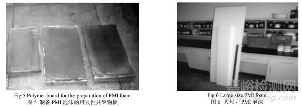圖5所示的是用于發(fā)泡成PMI泡沫成品的聚甲基丙烯酰亞胺預聚體,在發(fā)泡劑和高溫的發(fā)泡條件下可制備成如圖6所示的大尺寸PMI泡沫材料。在制備的過程中可能出現(xiàn)空洞、夾層、雜質(zhì)等現(xiàn)象,這與聚氨酯泡沫十分類似。此外由于PMI泡沫為絕緣體,極易產(chǎn)生靜電,從而導致膠層與泡沫結合不牢固,在使用過程中很有可能造成脫膠,并最終導致嚴重后果??梢岳锰掌澆▽ζ鋬?nèi)部缺陷進行檢測,其探傷原理和設備也可根據(jù)聚氨酯泡沫進行改進。