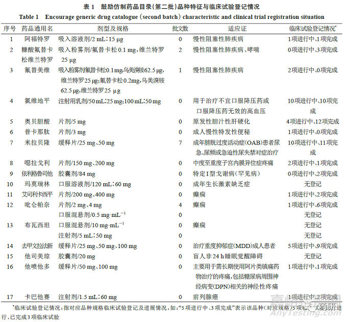 根據(jù)《關(guān)于印發(fā)第二批鼓勵仿制藥品目錄的通知》[3]中涉及品種情況,經(jīng)檢索國家藥品監(jiān)督管理局藥品監(jiān)管數(shù)據(jù)共享平臺(含進口及國產(chǎn))、國家藥品監(jiān)督管理局藥審中心藥物臨床試驗登記與信息公示 平 臺(http://www. chinadrugtrials. org. cn/index.html),從適應(yīng)證、劑型、有效準(zhǔn)文號數(shù)、藥物臨床試驗登記情況等(截至2022年9月15日),對涉及的17個品種逐一進行梳理,見表1。