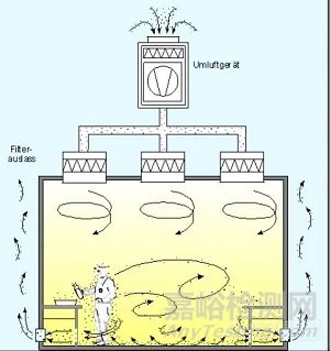 根據(jù)操作對(duì)象的不同,從室內(nèi)取出的空氣通常通過(guò)空氣處理系統(tǒng)再循環(huán),在空氣處理系統(tǒng)中過(guò)濾器去除微粒。如果工藝、原料或產(chǎn)品的含有大量水分,有害蒸汽或氣體就不能再循環(huán)回至室內(nèi)了,這種空氣通常被排出到大氣中,然后100%的新鮮空氣被吸到潔凈室系統(tǒng)中,處理后到潔凈室內(nèi)。